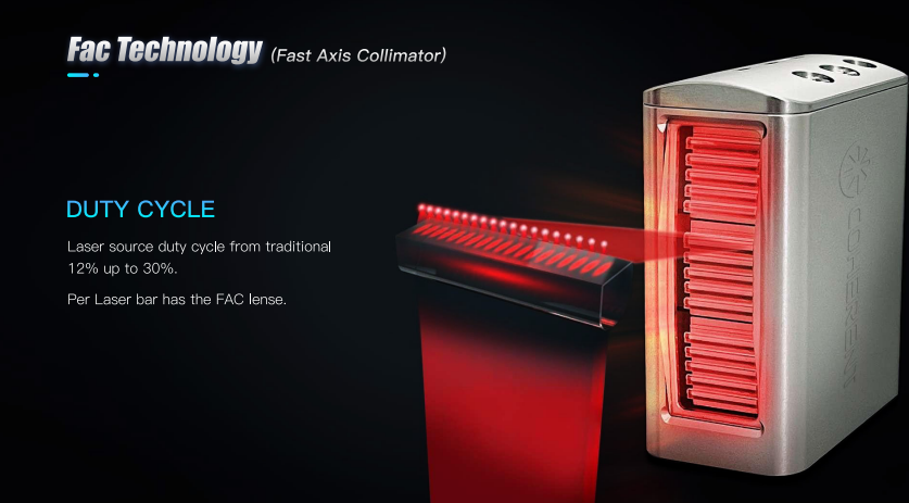 The duty cycle of the laser source differs from traditional ones from 12% to 30% because the power of each laser bar is 120 watts and greatly increases the working capacity and service life.