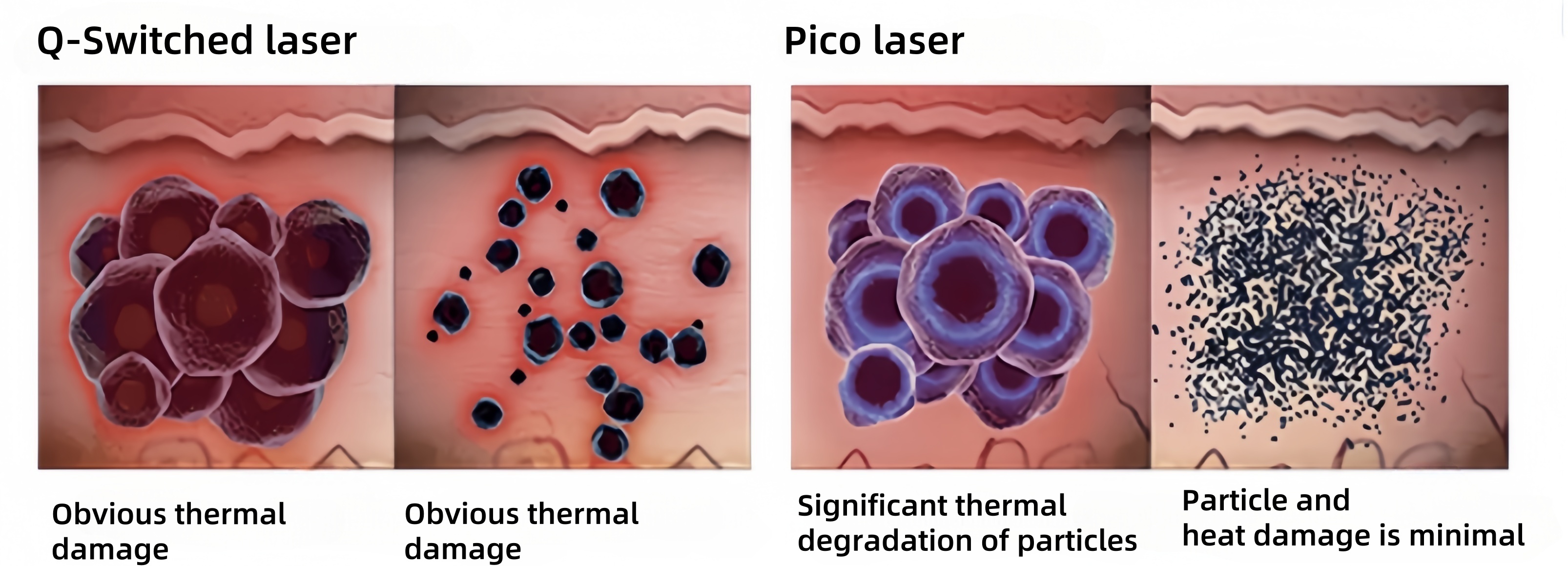 Q-Switched ND YAG laser: Yag laser explodes chromophome into small particles, picosecond laser explodes into grains of sand. Particles after processing with picosecond laser will be 13 times smaller than on Q-Switched ND YAG laser: Yag laser.