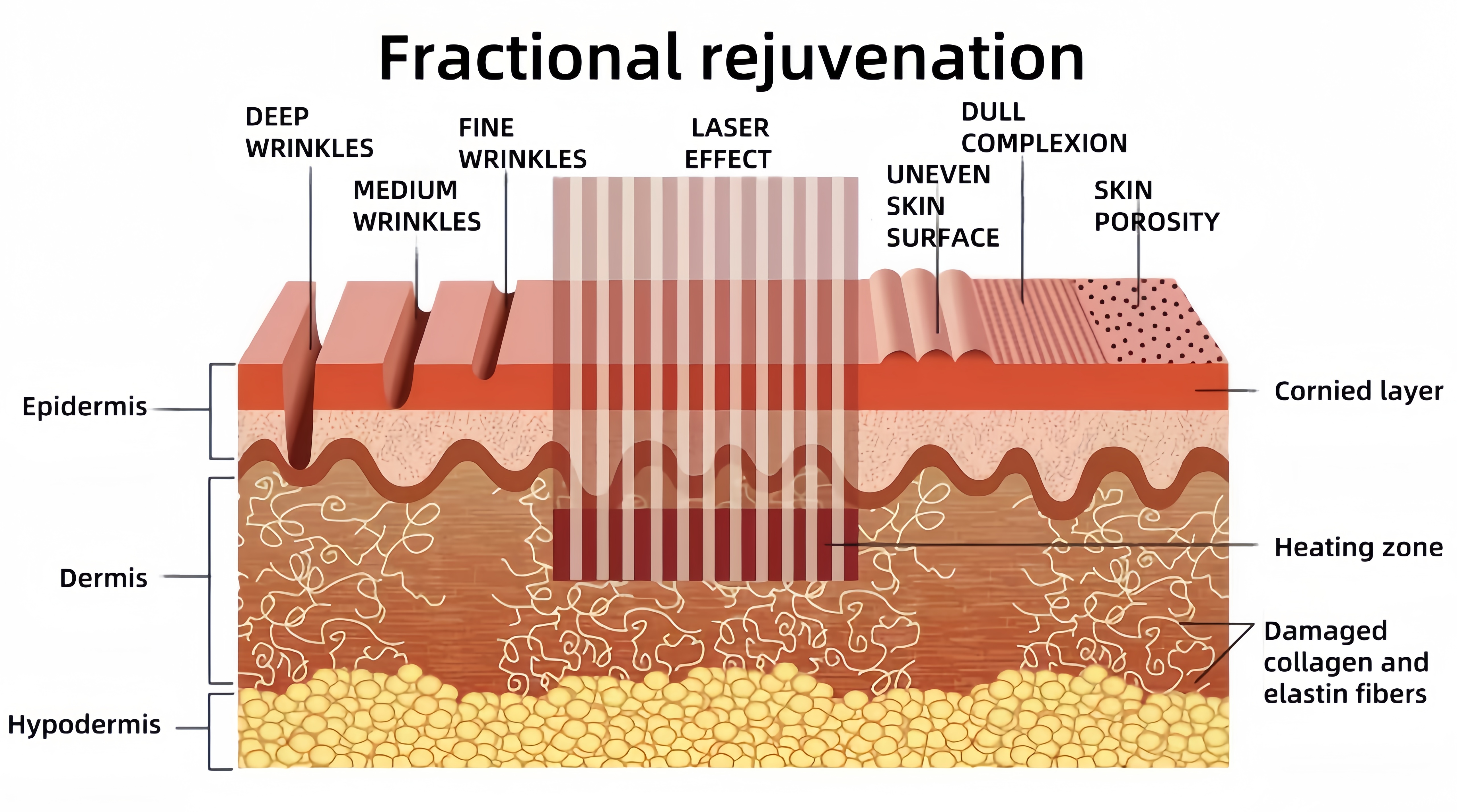 Acne scar removal, age-related keratosis removal, basal cell carcinoma improvement, burn scar treatment, laser rejuvenation, unwanted brown spots removal, wrinkle smoothing around the eyes and mouth area, postpartum stretch marks removal, neck, chest, arm rejuvenation, etc.